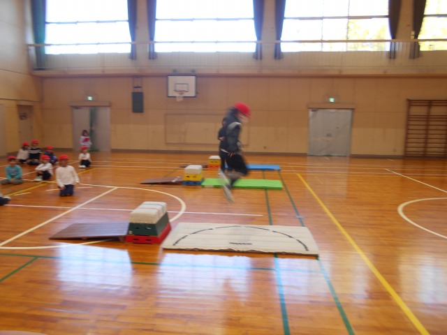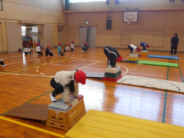 体育学習で「跳び箱」の練習を始めました。今日(2/3)が節分ということもあり、準備運動も兼ねて、最初にケンケンパをしながら前に進み、的(段ボール箱に鬼の絵を貼ったもの)に目がけて玉入れの玉を投げるゲームをしていました。その後、マットと跳び箱を協力して準備し、段階的(@跳び箱を踏み台にして大きくジャンプ、A跳び箱に手⇒足の順に乗った後に大きくジャンプ、B跳び箱に手と足をほぼ同時に乗せた後に大きくジャンプ)に跳び箱の練習を行っていました。