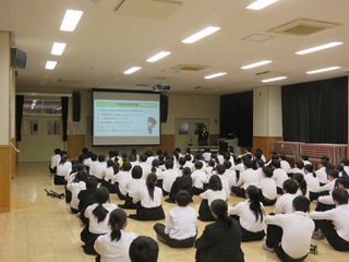 12月4日(木)、6限目に1年生で「いのちの授業」を実施しました。講師は、3年生でもお世話になった思春期保健相談士の中谷尚子先生です。中学生という年代は、子どもから大人へ成長する時期であり、特に自分の体の変化に戸惑い、心と体のアンバランスに悩みを感じる時期でもあります。中谷先生は、こうした悩みを抱えることは当然で悪いことではないと強調されました。そして、その悩みをため込まず、自分なりの解決法で上手に発散することが大切だと、優しく教えてくれました。子どもたちは、終始、真剣な表情で先生のお話に聞き入っていました。