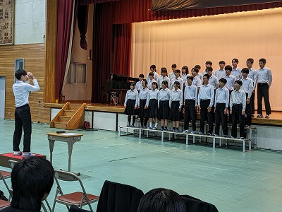 1年生はとにかく元気よく口を開けて歌うことを目標としています。2年生は去年に比べたら、ずいぶんきれいな合唱になってきました。3年生はやはりハーモニーが整ってきました。各学年の良さを発揮してください。