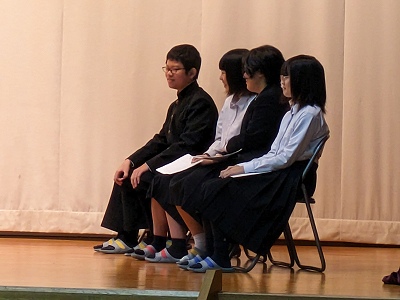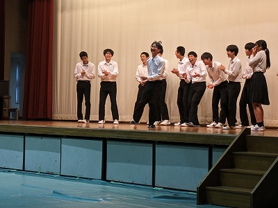 いよいよ文化祭当日です。午前の部はクラス合唱から始まって、英語スピーチ・人権作文発表・ピースメッセンジャー報告会と学習発表の色合いが強いアカデミックな内容ばかりです。合唱はどの学年・クラスも精一杯のパフォーマンスを発揮しましたが、その中でも3年生の両クラス合唱は、さすが!というものでした。