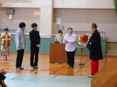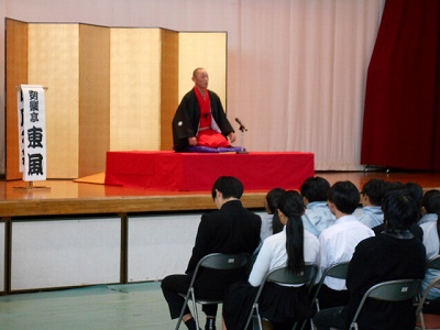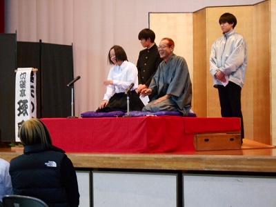 テストも終わってホッとしている(?)本日の午後、文化鑑賞会として、伊勢を中心に活動しているアマチュア落語会の方々(「寝床の会」)を招きました。古典芸能である落語についてみなさんに触れてもらいたいと思ったのですが、半数以上の人が落語を見たことがあると答え、さらに三分の一くらいの人が実際に落語をじかに見たことがある…という状況でした。実際に小ばなしを3人の生徒に実演したもらったり、小道具の使い方のクイズをしたり…と落語の世界を丁寧に教えていただきました。寝床の会のみなさん、本当にありがとうございました。