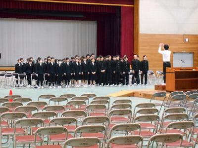 2年生が設営してくれた会場を使って、3年生の式練習も本格的に始まりました。山本先生の「一部の人がきちんとしていないとそれがものすごく目立ち、ひいてはそのようなゆるんだ雰囲気の学年である…と思われる」という言葉はまさにその通りです。自分一人の行動が、学年全体の評価につながるというものなのです。一同礼はだいぶそろっていましたよ!