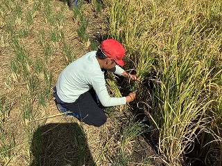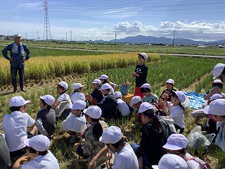初めての稲刈りに戸惑う子もいましたが、優しく手ほどきしてくださり、無事に作業を終えることができました。自分たちの手で育て、刈り取ったお米を手に、子どもたちの顔には大きな達成感が満ち溢れていました。