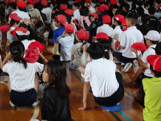 訓練では、地震時の身の守り方や、避難の合言葉「おはしもよ」(押さない、走らない、しゃべらない、戻らない、よく聞く)を再確認しました。