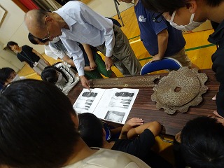 館長さんからは、戦時下の国民学校での勤労奉仕や、山田を襲った空襲の具体的な被害についてお話を聞きました。中には、小学3年生から工場へ働きに行った子どもたちがいたという事実に、子どもたちは衝撃を受けました。