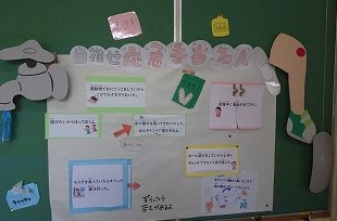 教育実習生の先生が作成してくれた「目指せ応急手当名人」の掲示物を展示中です。ケガをしてしまった時どうすればよいのか、 鼻血の止め方、すり傷の手当てなど、簡単なケガへの対応方法をイラストで分かりやすく解説しています。いざという時に落ち着いて行動できるよう、みんなで確認しておきましょう。