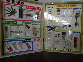授業では、三重県の啓発チラシや実物標本を使い、「なぜ薬物に手を出してしまうのか」という背景や甘い誘い文句の罠についても、分かりやすく教えていただきました。