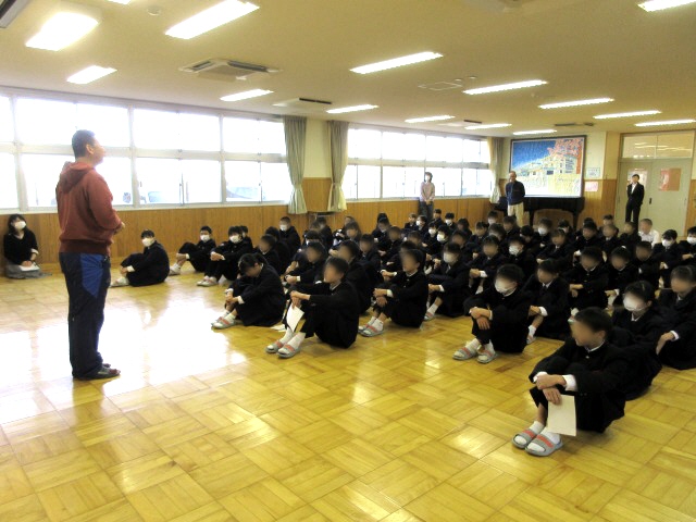 河村先生から、スマホや携帯などのSNSの使用による加害・被害への注意喚起、春休みや新年度の学習・生活のあり方などについて指導が行われました。