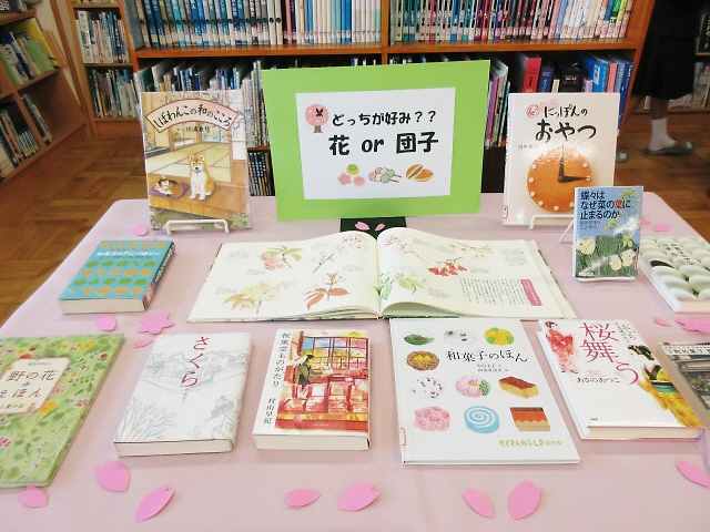 ◆図書館の後方のコーナーは、「どっちが好み??花or団子」にリニューアル。