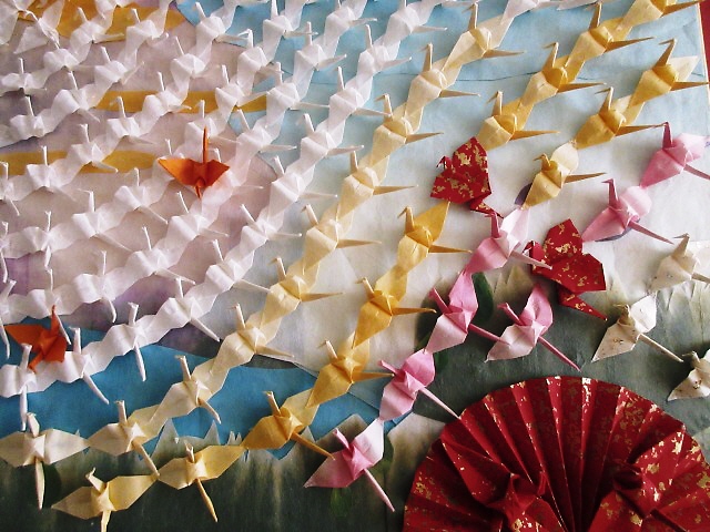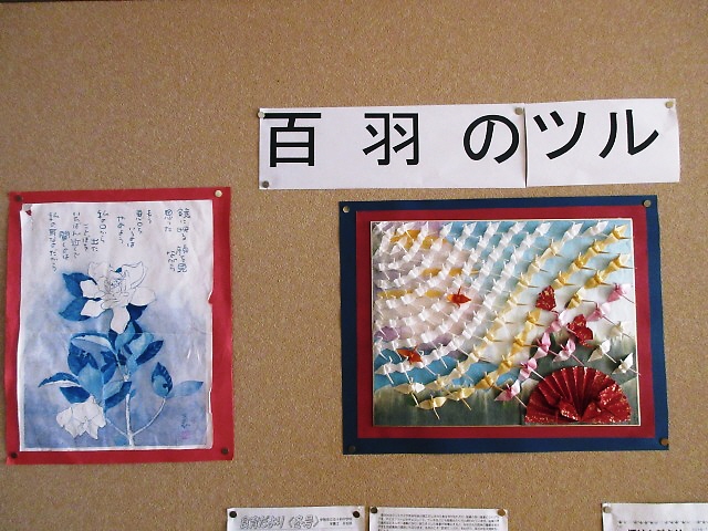 保健室前の掲示板に、「百羽のツル」をテーマにした鶴の折り紙を用いた作品が掲示されています。