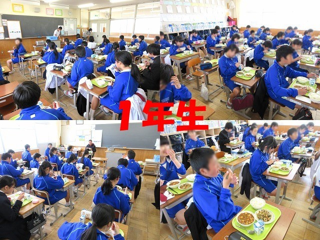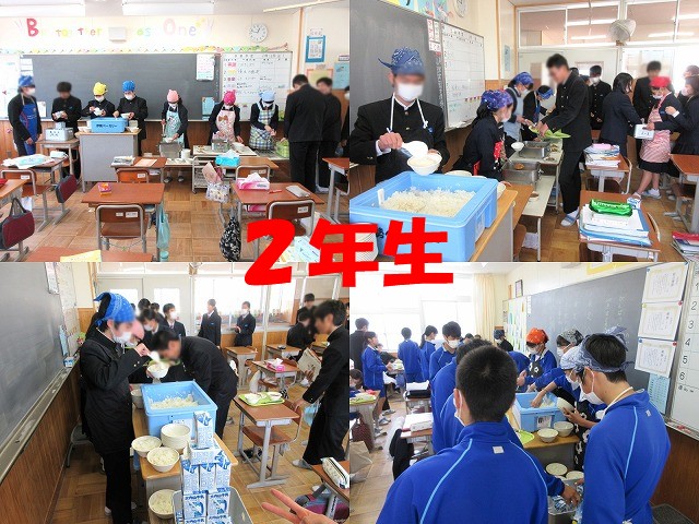 1・2年生の教室に行くと、いつもの通り、給食当番の生徒たちが配膳をしていました。