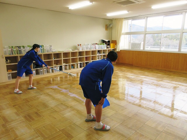 一人の生徒が水性ワックスをバケツから少しずつ床に流して、もう一人の生徒がモップを使って丁寧にワックスを伸ばしていきました。