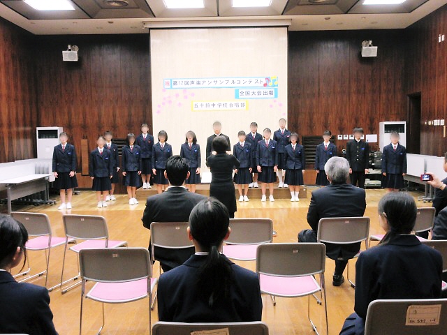 合唱部の生徒たちは、1年生から3年生までの全校生徒の前で、全国大会での健闘を誓うとともに本番で演奏する3曲を披露。