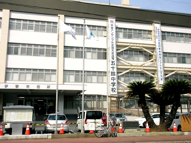伊勢市役所の建物前面には、現在、合唱部の全国大会出場を称える懸垂幕が掲げられています。