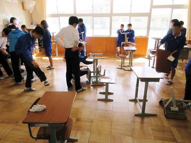 ※机、椅子の足の部分のゴミ取り/床の水拭き/黒板、窓、ロッカー、扉等の隅々までの水拭き…