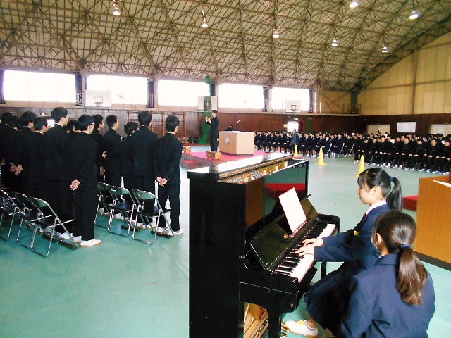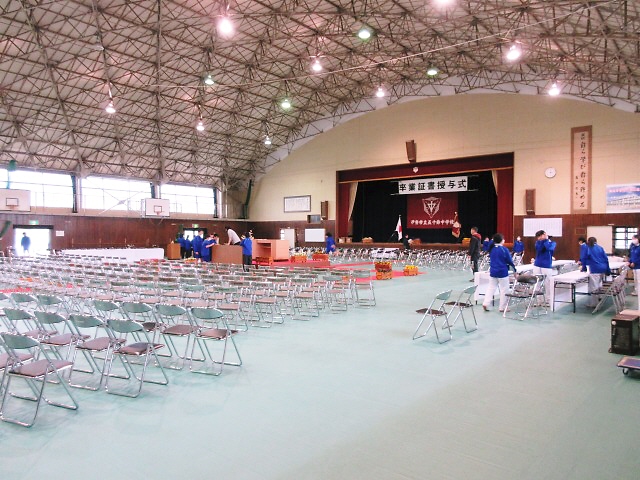 卒業式を明日にひかえ、全校生徒が1・2限目に予行練習を行いました。
