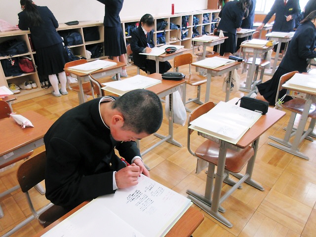 不思議に思いながら3年生の教室前まで歩いて行くと、たくさんの生徒たちが教室内にいて、卒業アルバムに思い出のメッセージを書き合っていました。