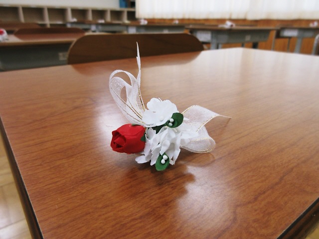 一人ひとりの机の上には、花飾りのコサージュが置かれています。