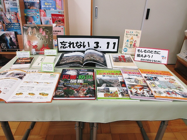 『地震・津波・火山噴火』『災害・防災 図鑑』『いのちを守る! 災害対策大百科 @災害はこうしておきる!−歴史と仕組み編−』『いのちを守る! 災害対策大百科 A災害がおきたらこうなる!−予測と備え編−』『いのちを守る! 災害対策大百科 B災害がおきたらこうしよう!−対処と行動編−』『備える! 3・11から』『もしときサバイバル術 Jr.』『東日本大震災 2011・3・11 「あの日」のこと』などの本も展示されています。