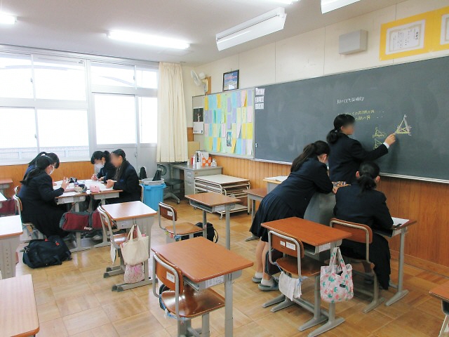 別のクラスでは、生徒が先生役をして、数学の証明問題を黒板に書いて友達に教えていました。