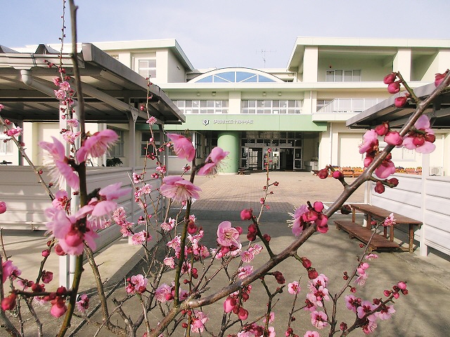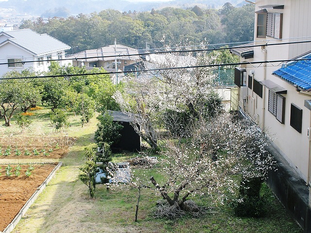 校門付近から東側に見下ろせる畑では、白梅の木がたくさんの花びらを付けています。