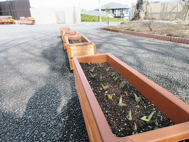 プランターのチューリップの球根は発芽し、小さな葉っぱが土の中から顔を出しています。