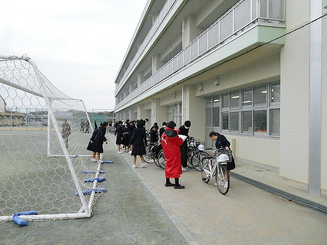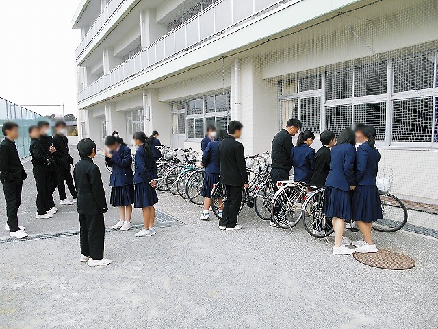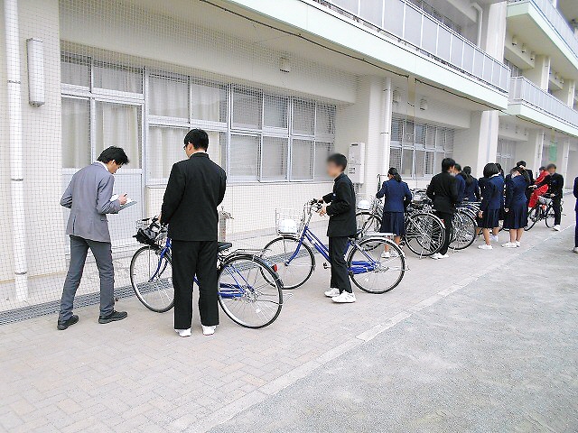 午後の授業の初めに、自転車置き場に停めてあった自転車を、運動場側の校舎沿いの通路に移動して、学年の先生に一人ひとり点検を受けました。
