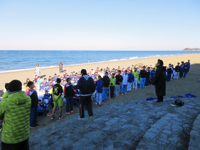 白波を立てながら蒼く輝く美しい海。暖かな日ざしと冬の冷たい海風の中で、生徒たちは互いに声をかけ合いながら、白い砂浜を元気に走りました。