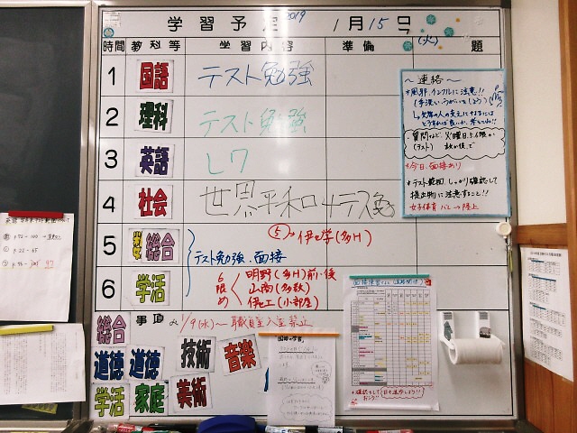 各クラスの予定黒板には、本日午後の予定として、「テスト勉強」と「面接練習」と書かれていました。