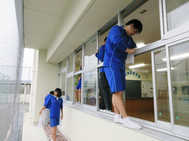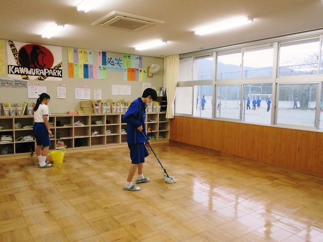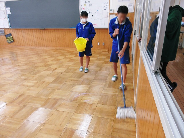 そして、放課後のワックス掛けに備えて、教室の床は、隅から隅まで綺麗に拭き掃除が行われました。