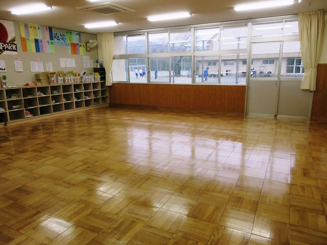 夕方、校舎内を見回ると、教室の床が周りの景色を映し出し、日の光を反射して美しく輝いていました。