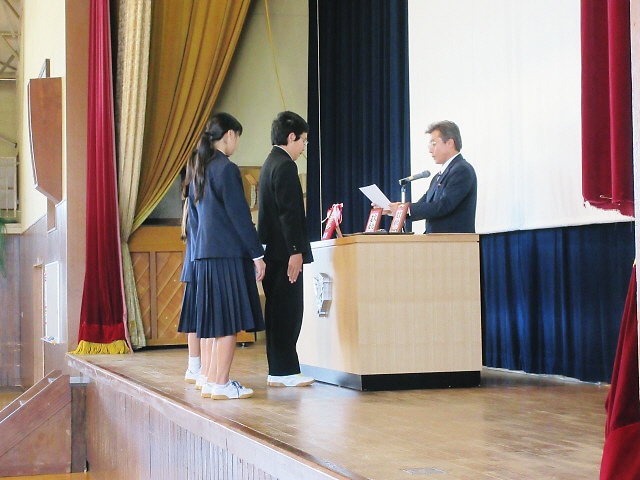 10月以降、各種大会で表彰された生徒に、全校生徒の前で賞状、盾、メダル等を手渡しました。