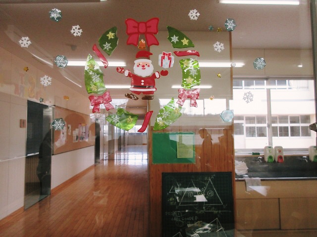 静かになった校舎内には、12月25日のクリスマスに関連した飾り付けが残されています。