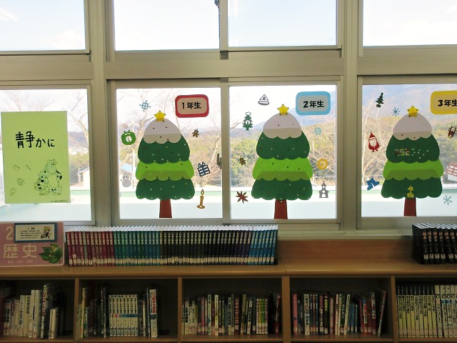 廊下のガラス窓に貼られたサンタのウォールステッカー、図書館の学年別のクリスマスツリーの掲示、来客用玄関に飾られた赤いシクラメン…。