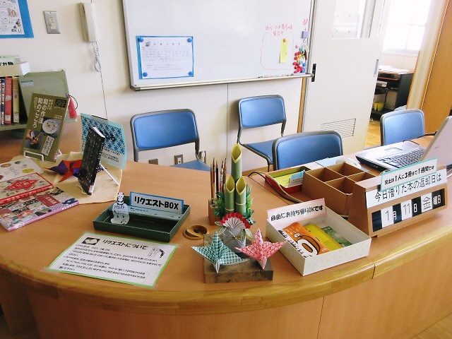 ◇貸出カウンターの上には、季節に応じた「門松のペーパークラフト」の飾り付けと新春にちなんだ「図書館おみくじ」の箱が置かれました。