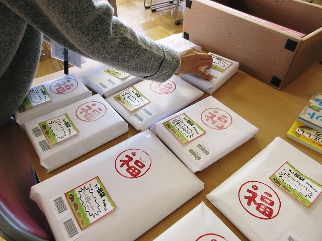 貸出用の図書が一冊ずつ白い紙で包まれ、その一つひとつに大きな赤い「福」の字のはんこが押されました。