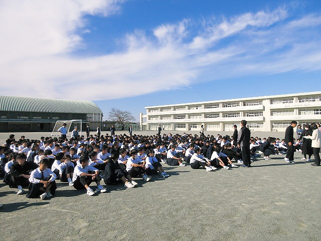 運動場や体育館にいた生徒たちは、すぐさま頭を抱えてしゃがみました。