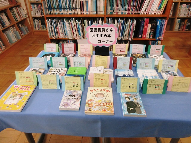 図書委員が一人一冊ずつ選んだお薦め本が展示され、それぞれにお薦めポイントを示したカードが添えられています。