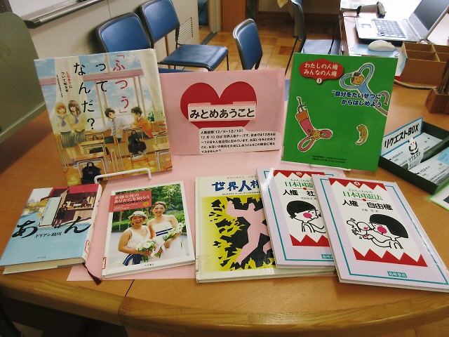図書カウンターの横に、『「ふつう」ってなんだ?』、『わたしの人権 みんなの人権@ “自分をたいせつに”からはじめよう』、『あん』、『多様な性のありかたを知ろう』、『世界人権宣言』など、人権週間にちなんだ本が展示されています。