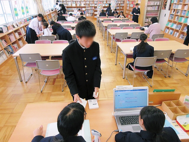 図書委員の生徒たちは、手慣れた様子でバーコードリーダーを使い、貸し出しの手続きをしました。