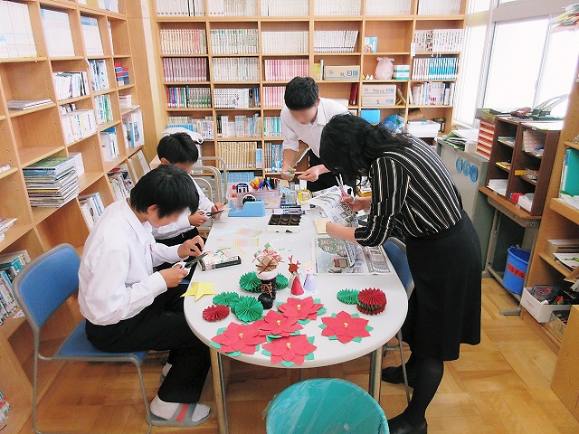 図書委員の生徒たちは、色画用紙を切ったり折ったりして、ポインセチア、クリスマスプレゼント、トナカイなどのペーパークラフト作りに一生懸命でした。