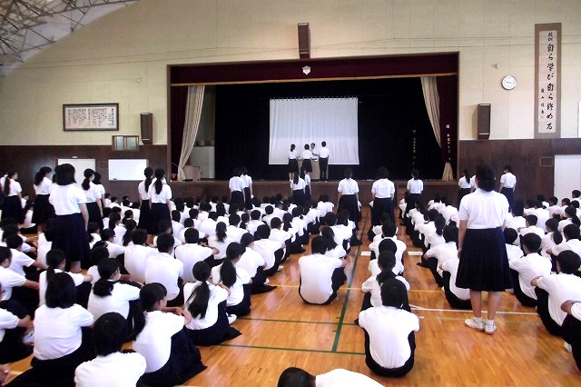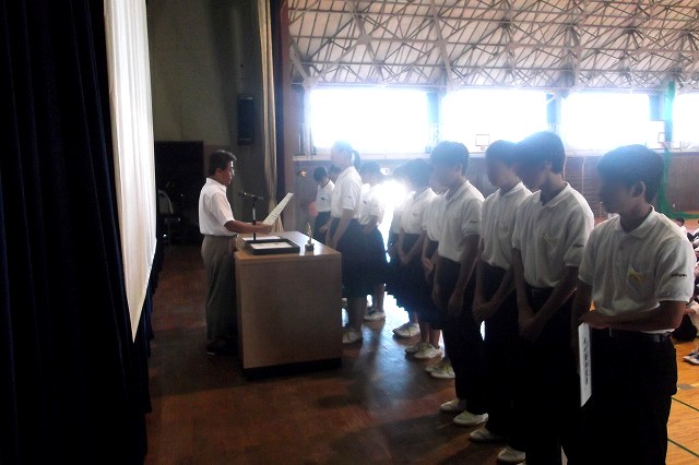 夏休み中に行われた各種大会で表彰された生徒に、全校生徒の前で賞状等を手渡しました。