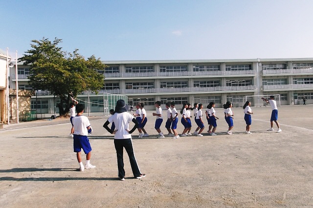 体育委員が前に並び、見本となる演技を見せて全体をリードしながら練習を進めました。