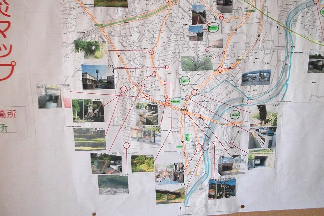 防災マップは、大きな校区の地図上に、危険箇所と避難所の位置の印を付け、危険物や建物の名称と写真を掲載したものです。