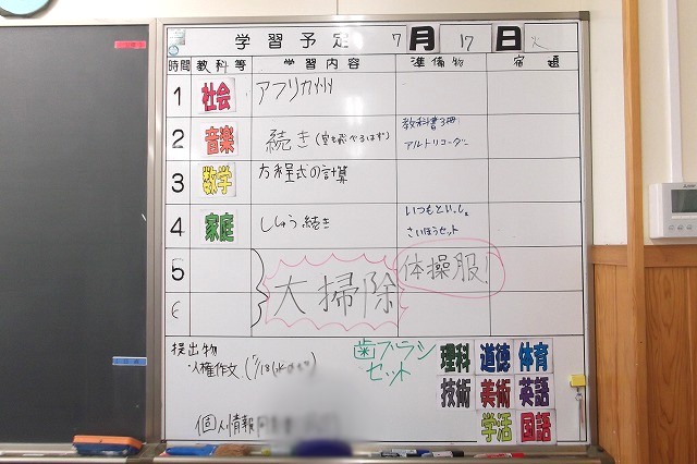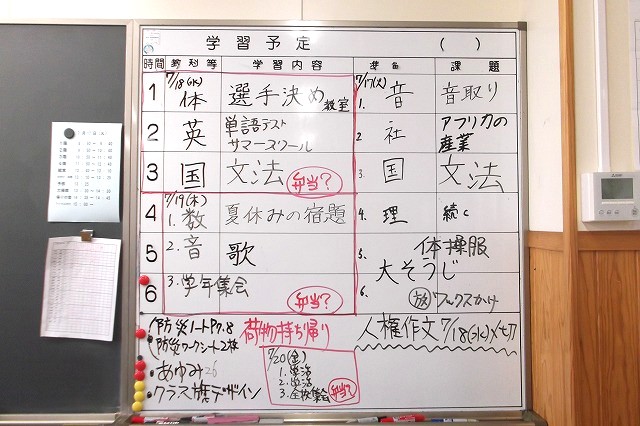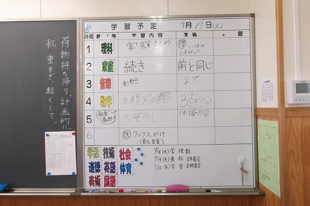 ※写真は1年生の予定黒板。左から、1−1、1−2、1−3。