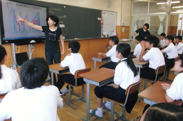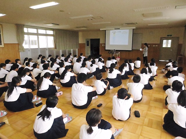 毎日1クラスずつが各階の多目的教室に集まり、養護教諭の飯田先生の指導を受けています。