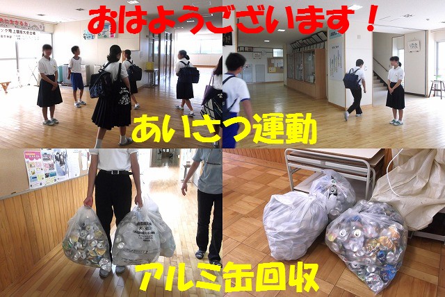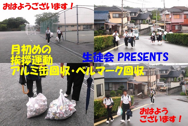 アルミ缶回収、ベルマーク回収、挨拶運動は、月初めの生徒会活動です。