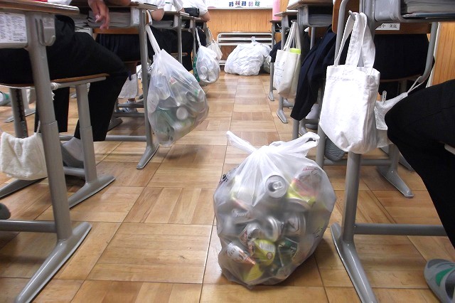 生徒たちは、アルミ缶の入ったビニール袋を持って登校しました。