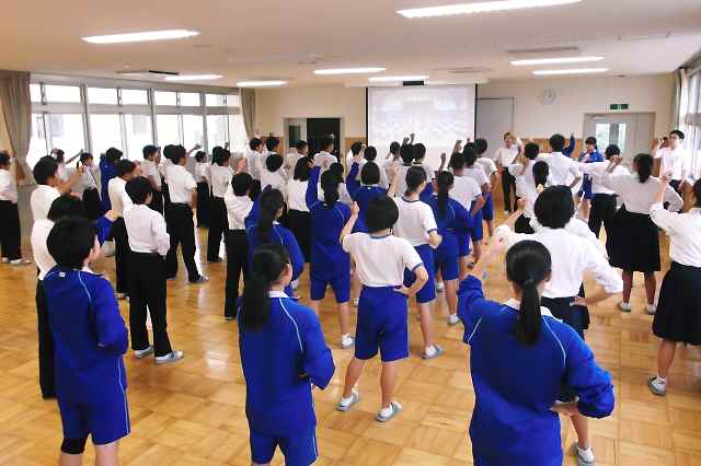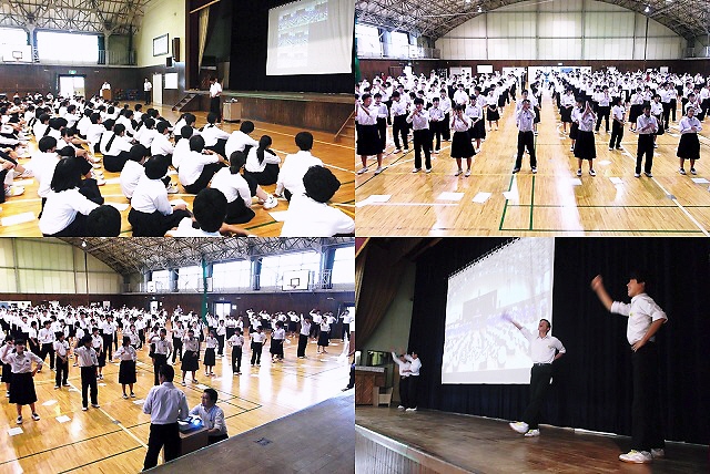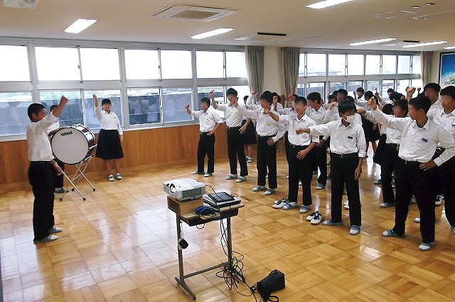 応援映像をステージ上の大型スクリーンに映して、応援の手本を示したり、みんなで応援練習をしたりしました。