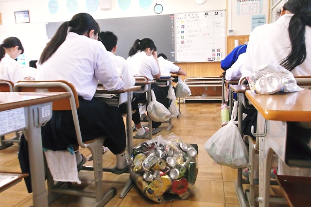 生徒たちが持って来たアルミ缶は、各クラスで個数を数えて、大きな袋にまとめられます。